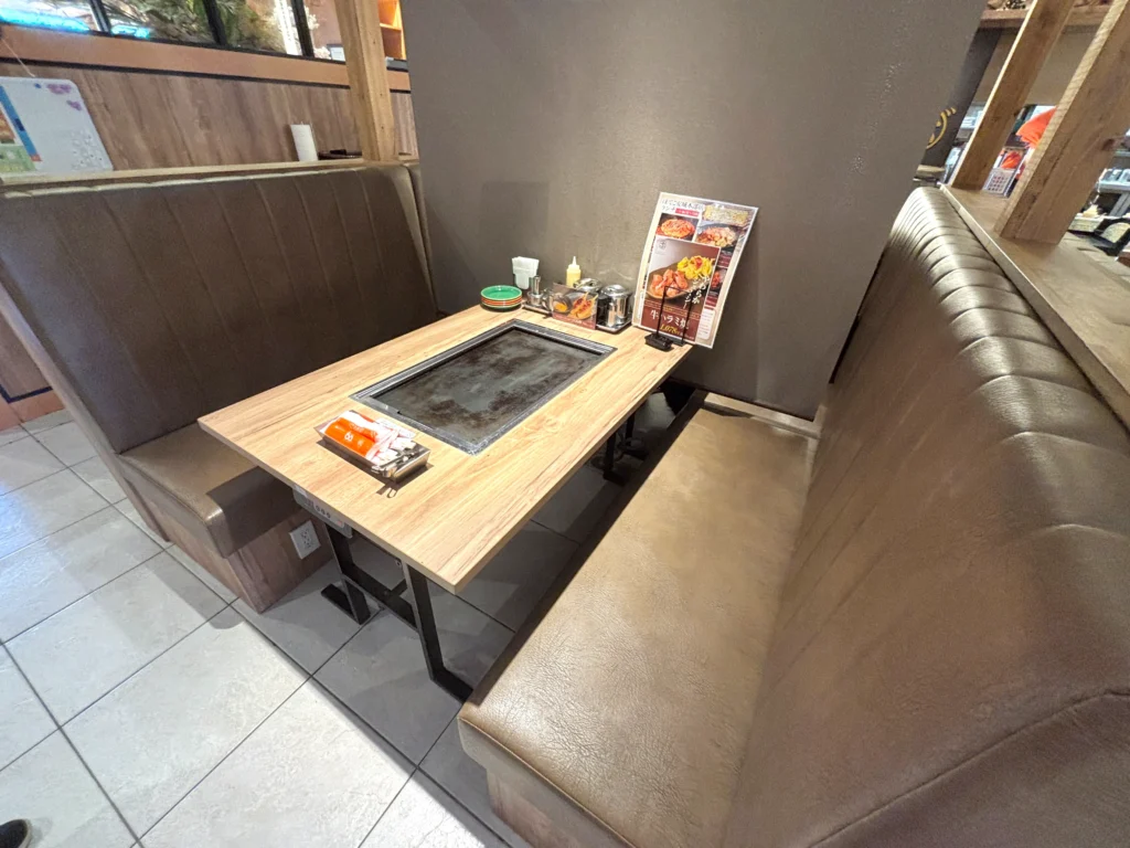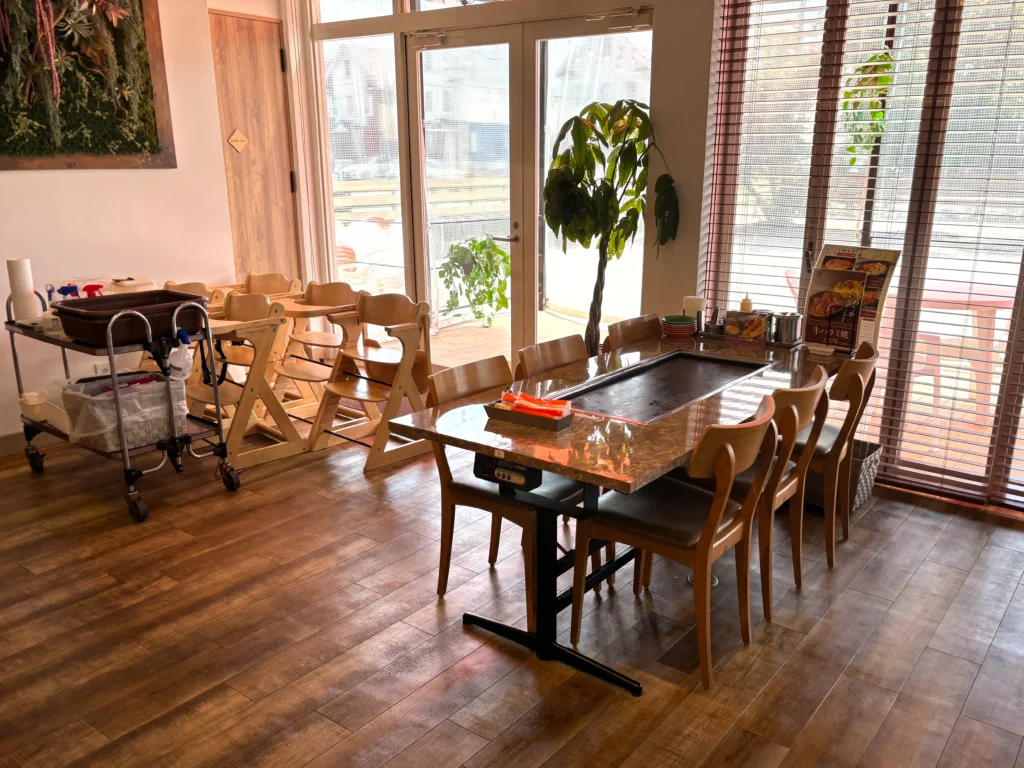 鉄板があるお店って、小さい子がいると正直ちょっとハードル高いな…って思うけど、ここはテーブル付きのベビーチェアがあって、鉄板からちゃんと距離が取れるから安心。