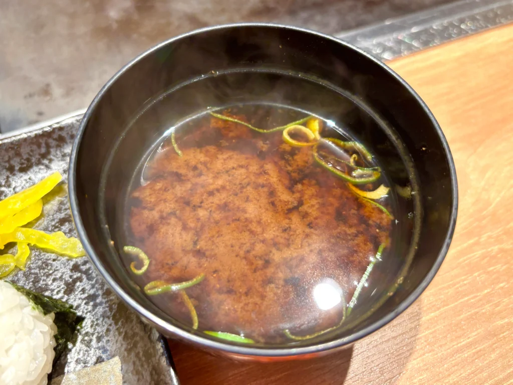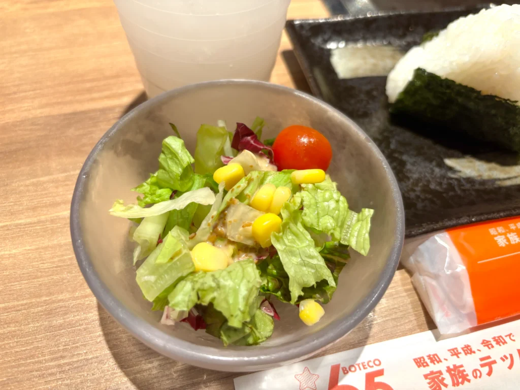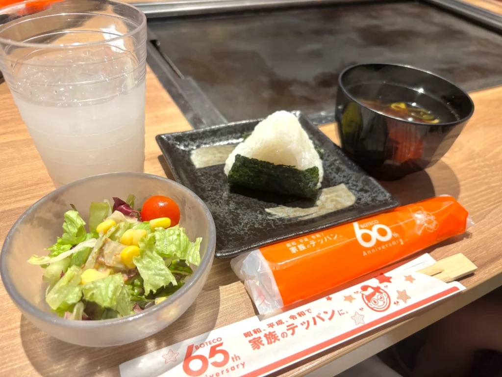 まず運ばれてきたのは、おにぎりと赤だし、ミニサラダ。ドリンクはドリンクバーで好きなだけ飲めます。