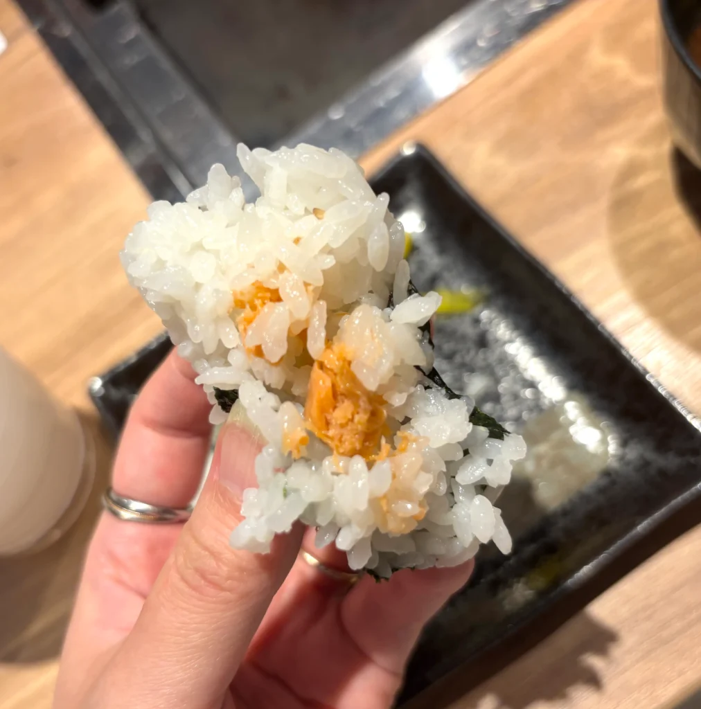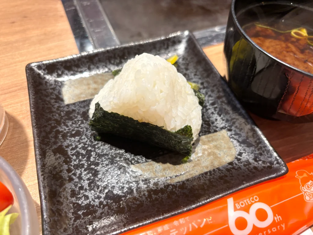 おにぎりは中身は鮭。小ぶりだからお好み焼きが来る前につまむのにちょうどいいサイズ感。