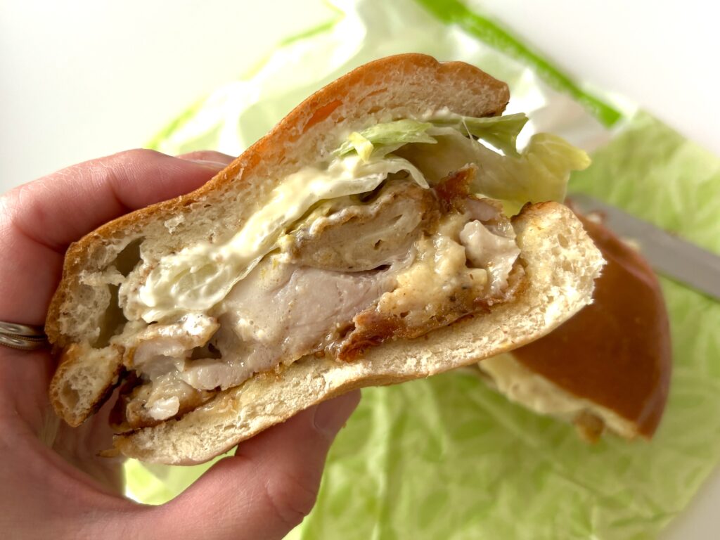 チキンは1枚肉で存在感があって、かぶりつくと肉汁じゅわっと出てくるほどジューシーで食べ応えあり◎