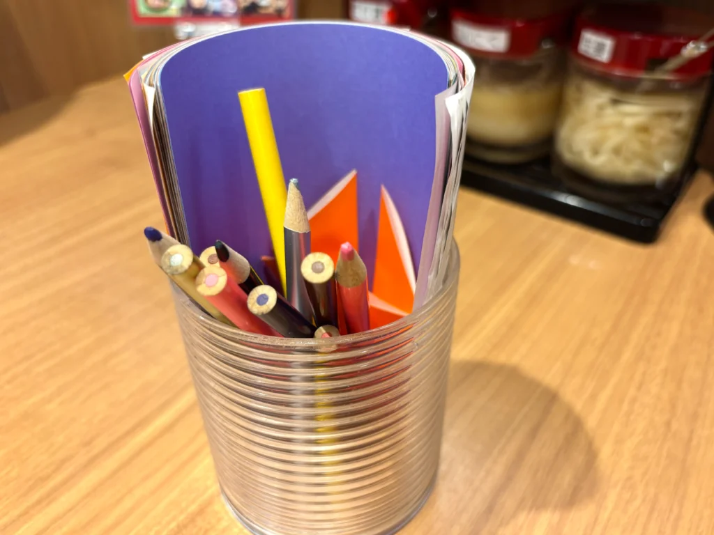 それに、テーブルの上には色鉛筆と折り紙が用意されていて、待ち時間に子どもが退屈しにくくて、これは本当に助かりました。
