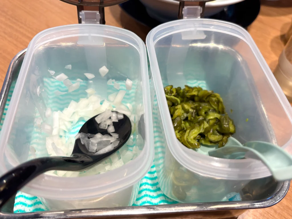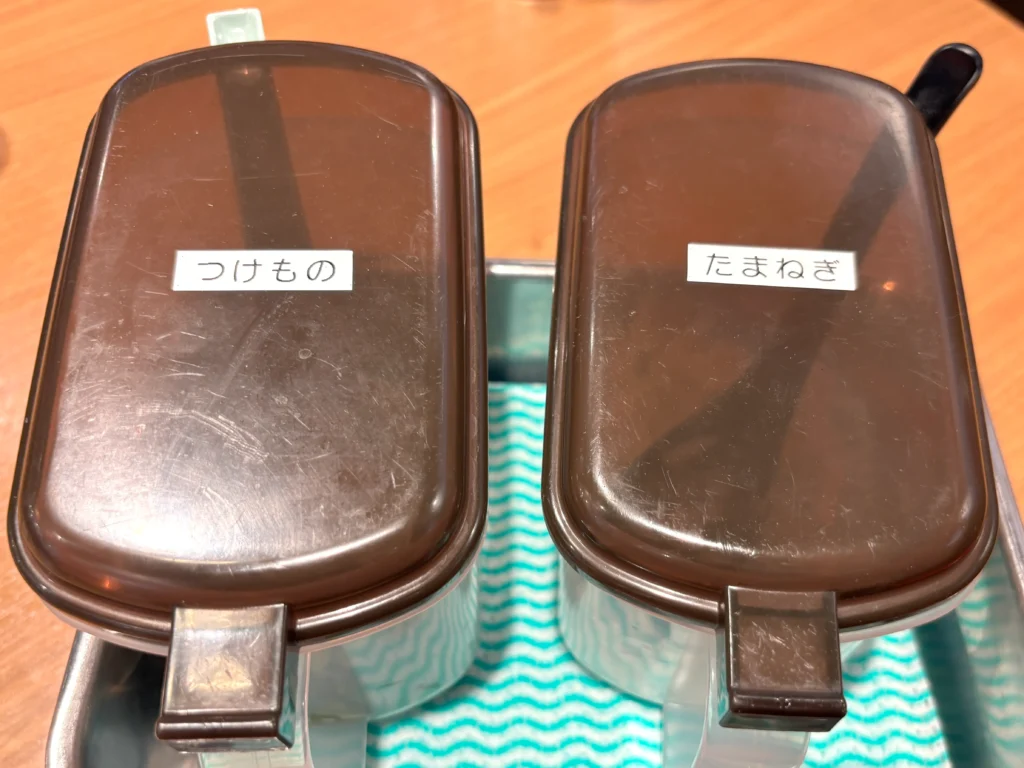 卓上を見渡すとつけものとたまねぎが置かれています。あとで味変に使えるかなと楽しみ。