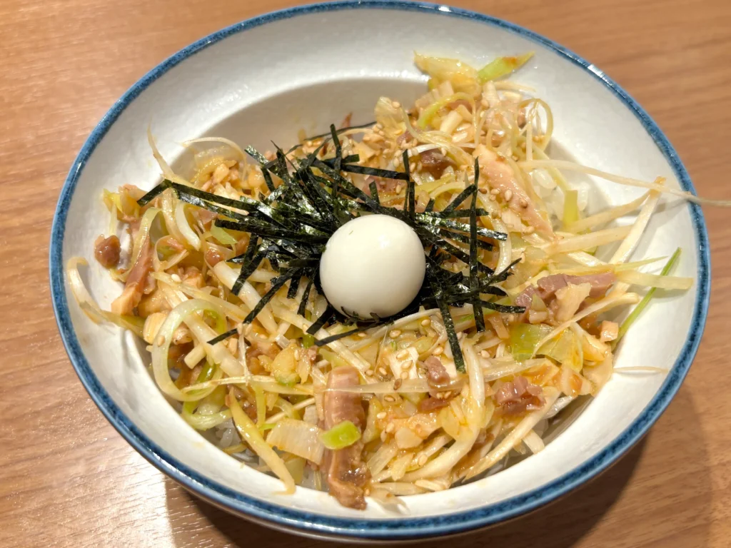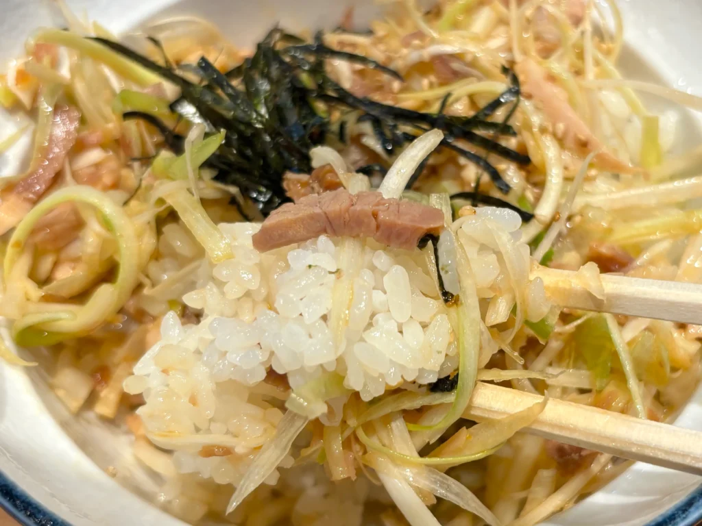 小ネギチャ丼は、刻みチャーシューにたっぷりの小ネギ。シンプルだけど、こういうのが一番間違いないやつ!