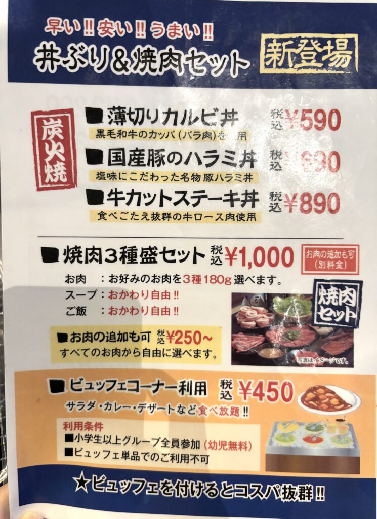 メニューはざっくり分けて、「丼もの」「焼肉3種盛り」「焼肉食べ放題コース」があります。