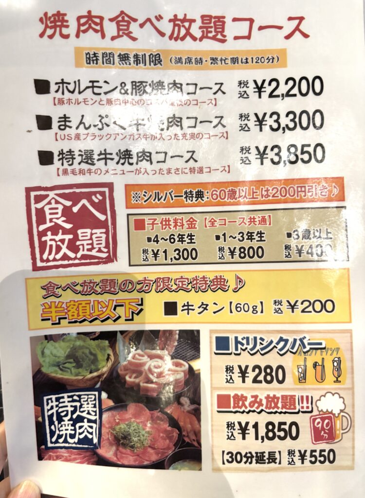 焼肉の食べ放題は、一番ライトなのが「ホルモン&豚焼肉コース」、US産のブラックアンガス牛も選べる「まんぷく牛焼肉コース」、ちょっと贅沢に黒毛和牛が食べられる「特選牛焼肉コース」の3コースに分かれています。