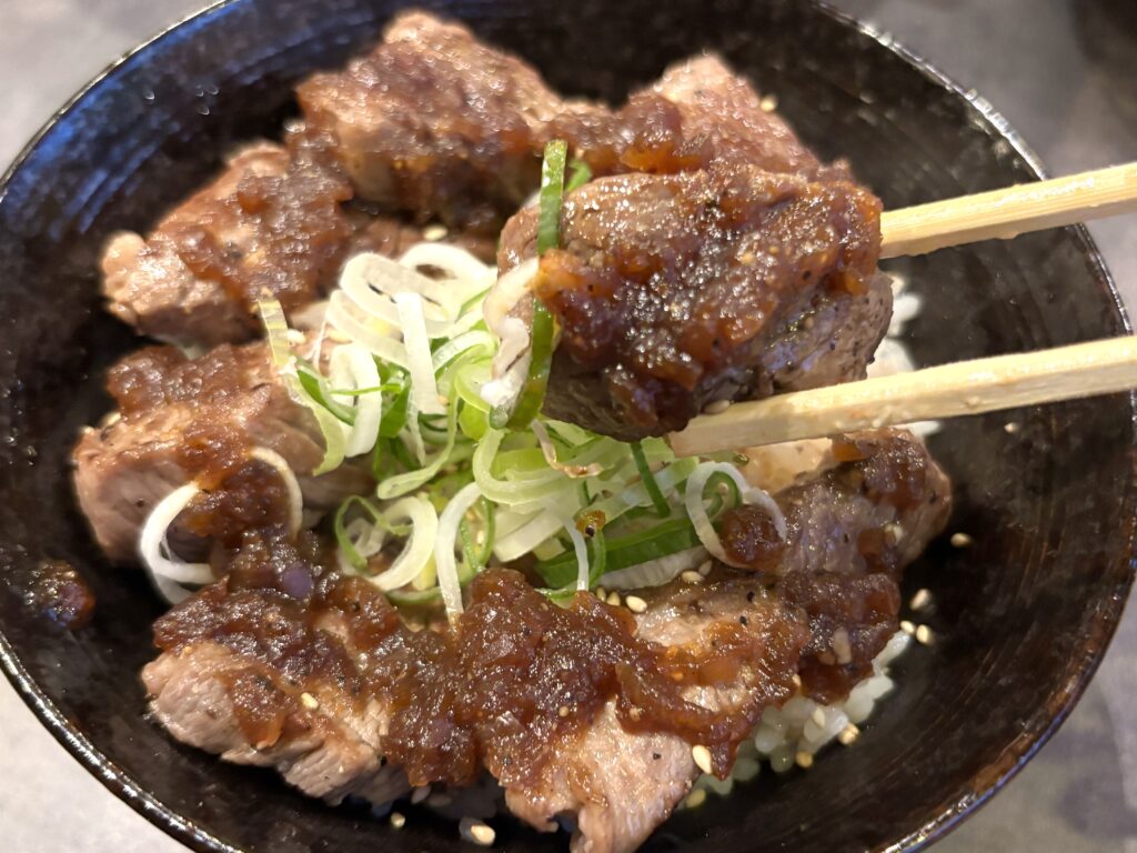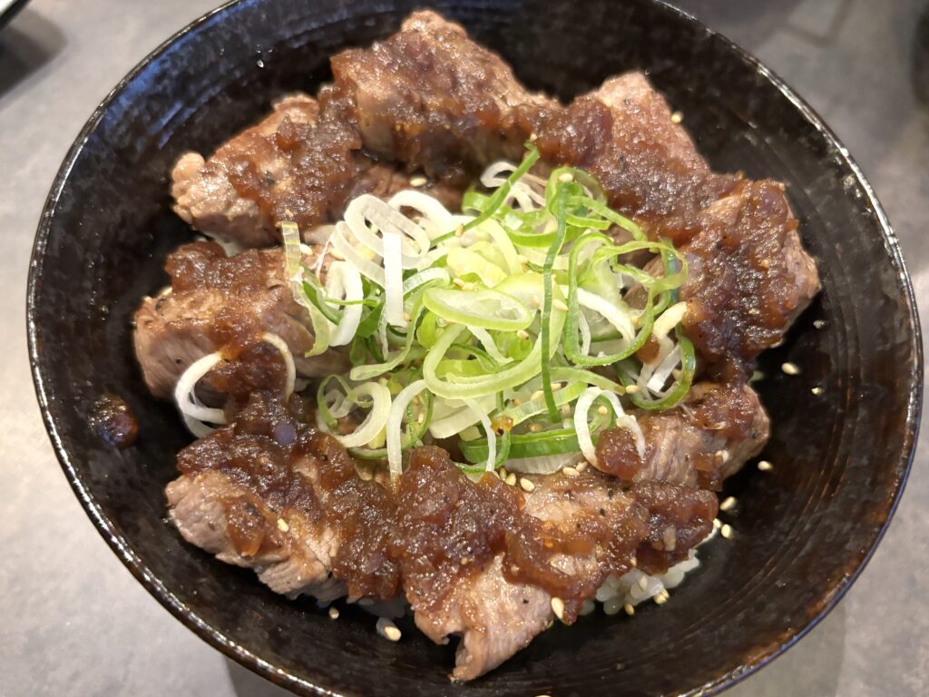 お肉は肉厚で、その分ちょっと噛みごたえあり。でも脂っぽすぎないから重くならないし、赤みの旨みがちゃんと感じられるタイプ。かかってるタレもまたおいしくてごはんも進みます…!