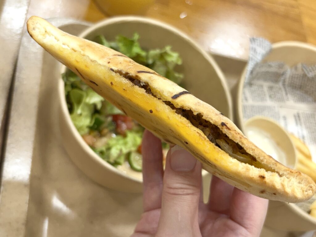 ピタパンは少し硬めで、しっかりした噛みごたえ。もっちりというよりは、外側がパリッと固めで、中の具材と一緒に食べると満足感あり。