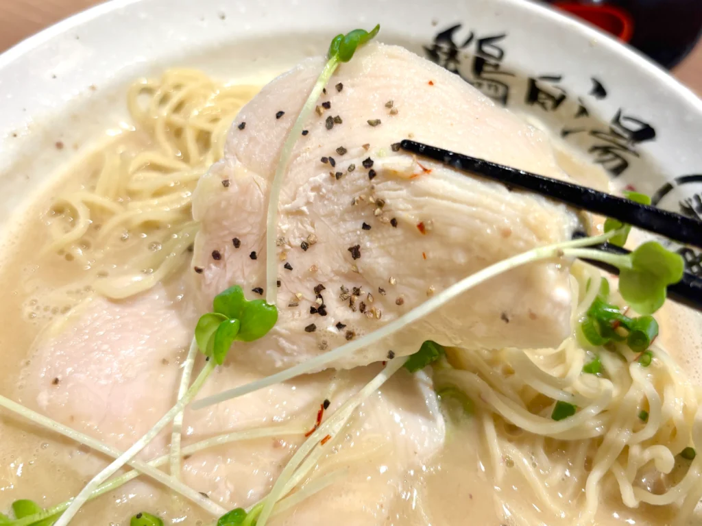 鶏チャーシューは、脂身の少ないあっさり系で、しっとり柔らかい食感。濃厚鶏白湯スープとの相性も抜群。