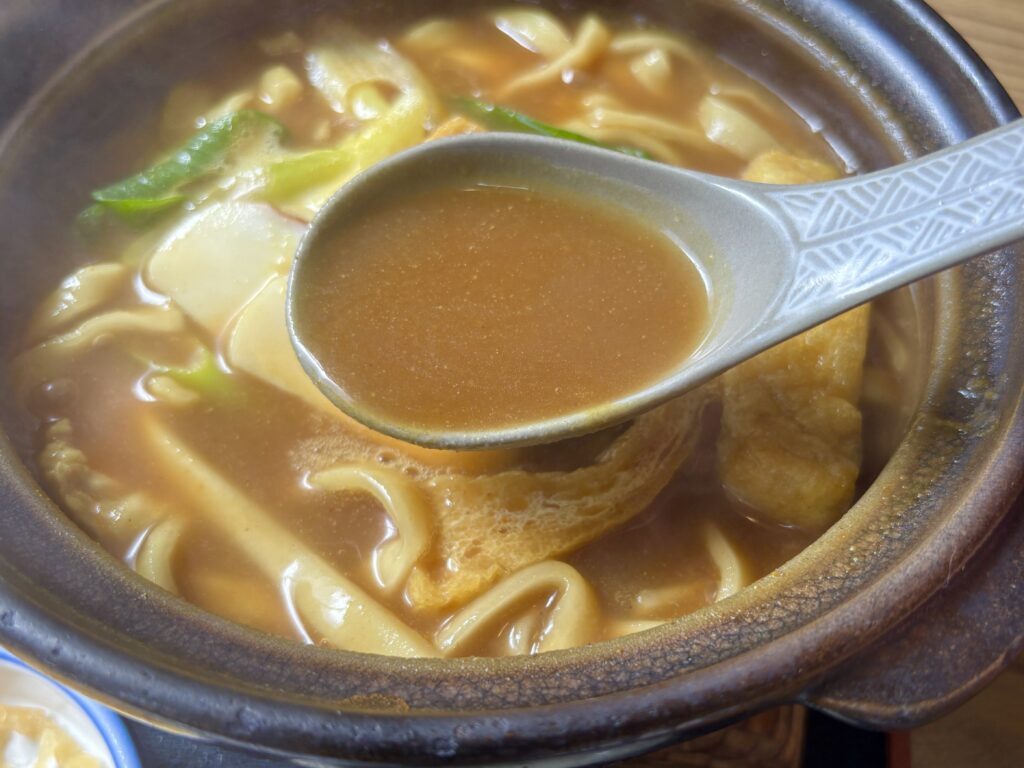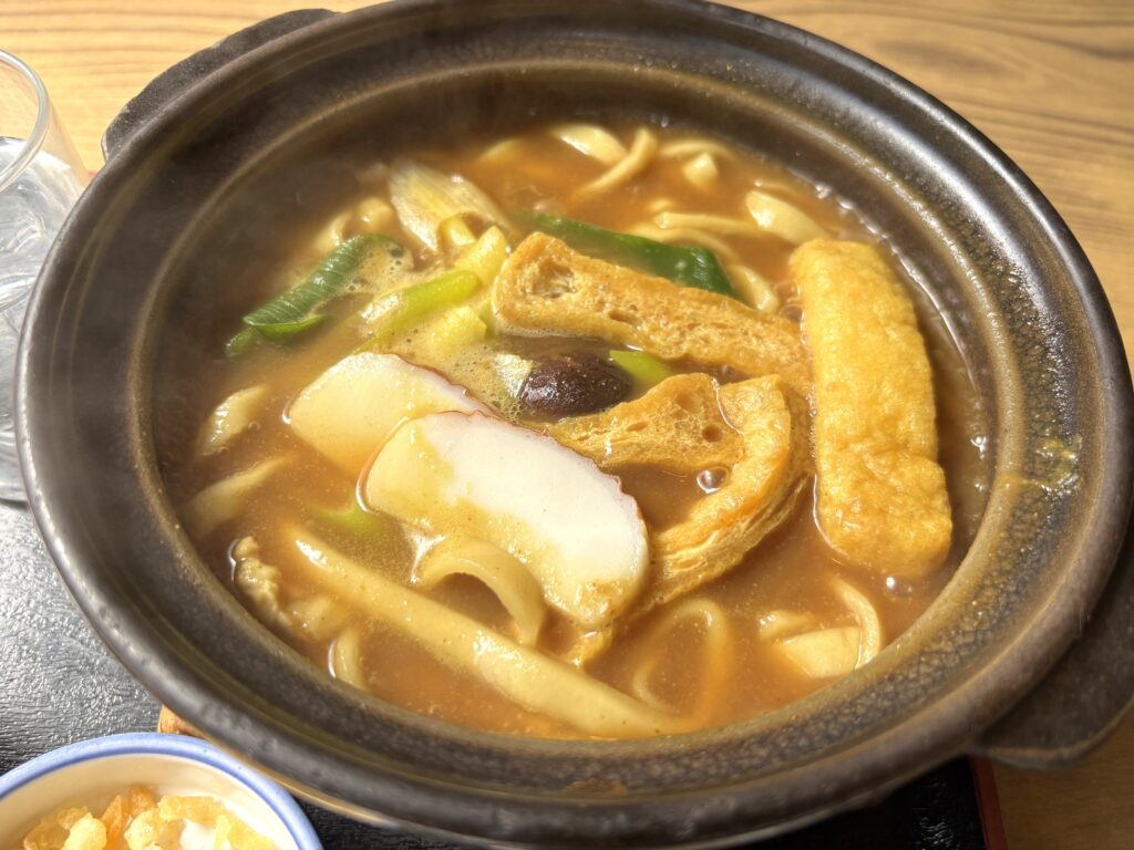 まずはお店の人気メニュー、カレー煮込みうどん。味噌煮込みとカレーうどんが組み合わさったいいとこどりの一品。
