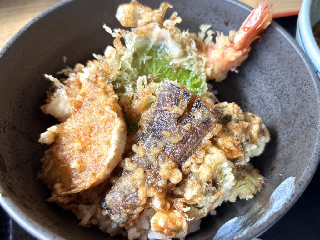 天丼は、海老やナス、大葉などが盛られています。甘辛めなタレがかかってシンプルなお味。